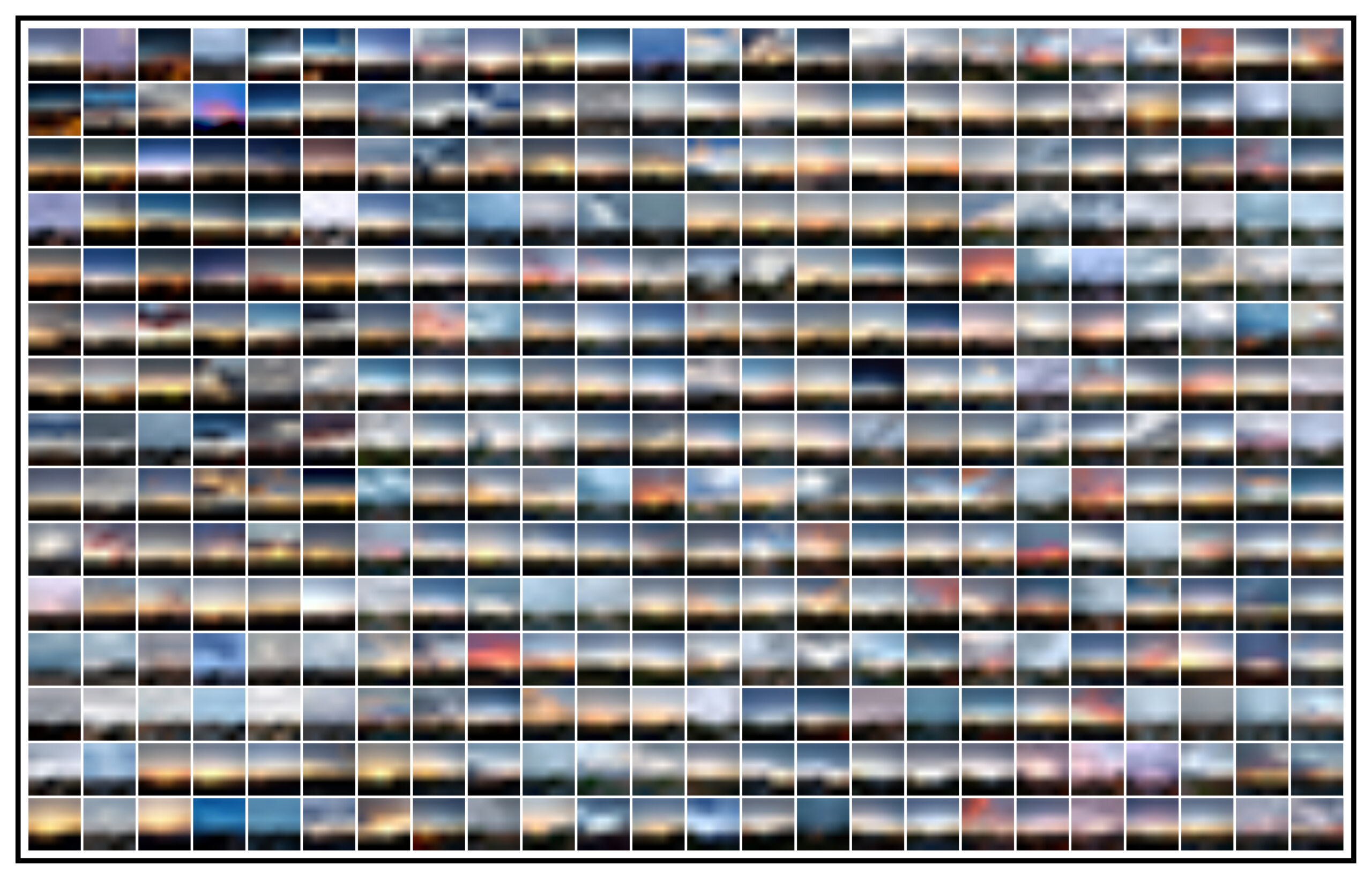 Oui j’ai eu une idée. Réaliser une photo par jour devant chez moi pendant 365 jours. Mon protocole, toujours le même endroit (ma fenêtre), la même focale, prendre la même vue, (le lever du soleil). Seul l’angle de lever du soleil change. J’ai axé mon travail sur les nuances au lever du soleil. J’ai imprimé une fresque de 3 fois quatre mois.